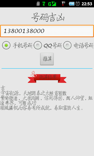 号码,数也;故举凡号码,均与周易数理具有吉凶关联,就像风水、姓名会影响运势命运的意义是一样的。号码吉凶,是根据周易数理预测之原理,来测试号码对主人的运势影响。该款手机应用通过用户输入手机号码、qq号码,或者电话号码,去预测主人的吉凶运势,帮助用户逢凶化吉、择吉避凶。