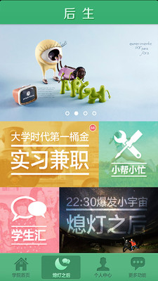 中国在校大学生生活平台。为在校大学生提供真实可靠的兼职实习工作,扩大在校大学生的社交圈,是大学生日常生活工作的助手与交流平台。