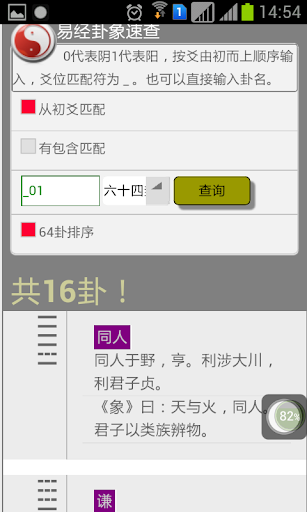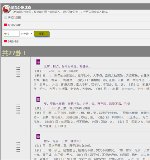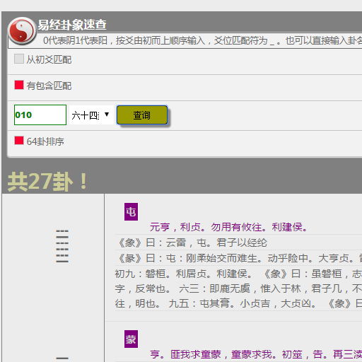 为周易爱好人士提供的一款小工具,基于爻的查询方式,直接输入爻(0和1表示,0阴1阳)或者卦名,就可以按照要求匹配查询,结果包括原生的卦词,彖,象和爻辞。简单明了,随身必备!!