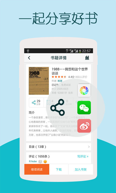 5、全面互动体系:提供投月票、晒书单等活动功能,通过微信等一键分享客户端
