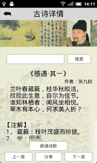 本软件收录了李白、杜甫、王维、李商隐等77家诗,共计300余首并且每一首都带有注解、韵译及评析,让你全面了解本诗的由来而且自带有免费语音朗诵功能,标准的普通话发音,让你不仅会看还会读!