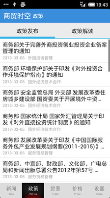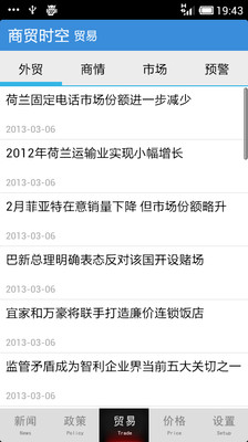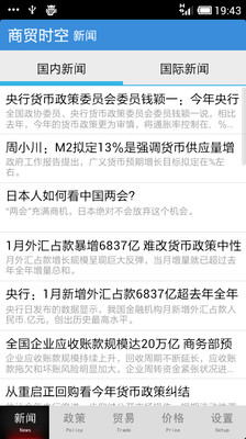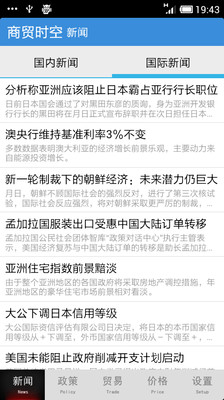 基于 Android 平台的商务时空客户端,提供国内、国际商务新闻,国内经济新政策,政策的专家解读,提供贸易数据、市场分析数据和商务预警内容,国际交易中心的农产品,金属,能源的价格。