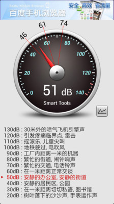 这款小工具会显示当前的最高,最低,现在值和平均值的指示线.同时,这款软件支持将画面颠倒过来,通过倒置之后,你可以将手机倒过来将麦克风指向噪声来源,以精确测量噪声源的分贝值.