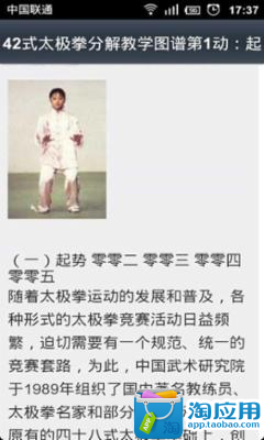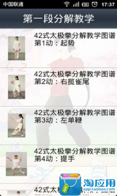 四十二式太极拳(又名42式太极拳),它以杨式太极拳为主,吸收陈式太极拳的发劲动作,吴式太极拳的平圆动作以及孙式太极拳的舒展圆活动作。动作气势舒展大方,动作劲力刚柔并重,动作速度刚柔有变。本应用为您图文详细介绍四十二式太极拳法哦!