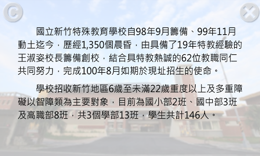 學校招收新竹地區6歲至未滿22歲重度以上及多重障礙以智障類為主要對象,目前為國小部2班、國中部3班及高職部8班,共3個學部13班,學生共計146人。