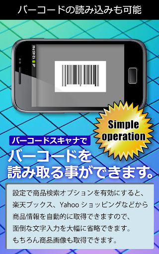設定で商品検索オプションを有効にすると、Yahooショッピングなどから商品情報を自動的に取得できますので、面倒な文字入力を大幅に省略できます。もちろん商品画像も取得できます。