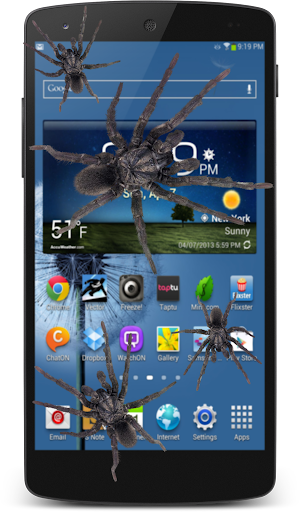 你想要開可怕的玩笑嗎?你想要嚇到別人嗎?你的朋友討厭昆蟲和蜘蛛嗎?在手機裡的蜘蛛,使一個非常可怕的玩笑 !在手機裡的蜘蛛是一款免費的應用,其中顯示在螢幕頂部的現實蜘蛛 !在你的螢幕可怕的蜘蛛網路和蜘蛛將顯示。他們將會通過螢幕。蜘蛛會在其他應用程式的頂部,所以他們將看起來像真正的動物 !每一個人不喜歡這種可怕的狼蛛會害怕 !當狼蛛會出現您通常可以使用您的手機。受害人將用電話和爬行動物會突然冒了出來 !您可以設置蜘蛛 — — 的數量從 1 到 3 狼蛛的蜘蛛。如何使用電話的蜘蛛?安裝這個可怕的應用程式並打開它。按一下顯示蜘蛛按鈕,給一個朋友的電話。他將使用它時突然可怕的蜘蛛會出現,嚇唬你的朋友 !在每時每刻,您可以移除爬行動物通過按一下螢幕頂部的通知。生物都顯示在所有應用程式。這就是為什麼你看到可怕錯誤的時間,無論你在做什麼,在你的手機上。在手機裡的蜘蛛的主要優勢:-非常逼真的動畫的蜘蛛-您可以設置的爬行動物數量 — — 當蠕蟲穿過螢幕-它是免費的時候可以正常使用你的手機 !