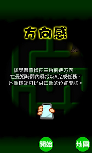3.「方向感」遊戲,利用行動裝置移動感應器功能,搖晃裝置控制主角的移動方向,在迷宮內尋找Q&A完成任務。