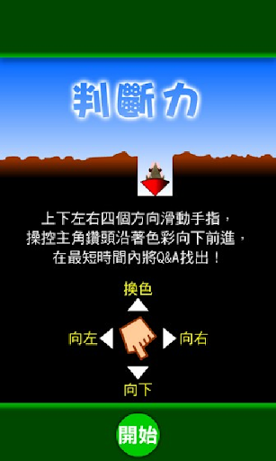 1.「判斷力」遊戲,手指上下左右四個方向滑動,指揮遊戲主角前進方向或更換顏色,沿著色彩向下前進尋找Q&A。