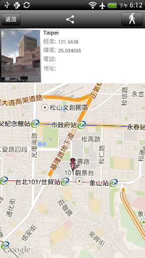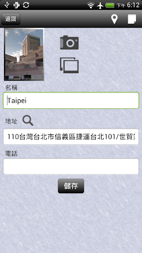 5. 地點編輯: 編輯記錄的地點資訊包含地點名稱、地址、電話以及相片, 你也能直接查詢該地點的地址。