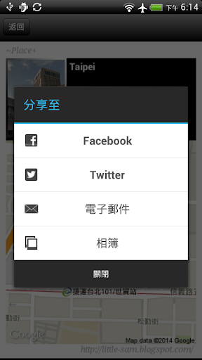 8. 分享相片: 你可以分享地點相片到臉書(Facebook)塗鴉牆、推特(Twitter),以電子郵件寄送給朋友或是直接儲存到相簿中, 當你分享記錄的地點相片到臉書上時,你也同時可以對該相片打卡。
