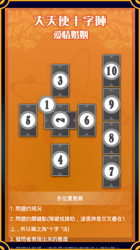 5. 塔羅進階自我占卜:採用78張完整塔羅牌,精選三種最實用的塔羅牌牌陣(戀人金字塔、工作六芒星與大天使十字陣),針對愛情婚姻與工作學業兩大方向,如同實體算牌的選牌流程(甚至可單獨決定每張牌的方向改變),並根據牌陣不同位置、每張牌正逆位的專屬對應解釋(免費版恕不提供大天使十字陣占卜功能);