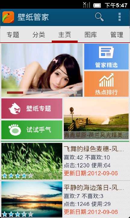 您可以通过壁纸热度及用户投票评级能够快速发现自己喜欢的壁纸。分类包括夏日清爽,自然风景,简约风格,美女,游戏动漫,影视明星,体育汽车,艺术手绘,另类非主流等等。