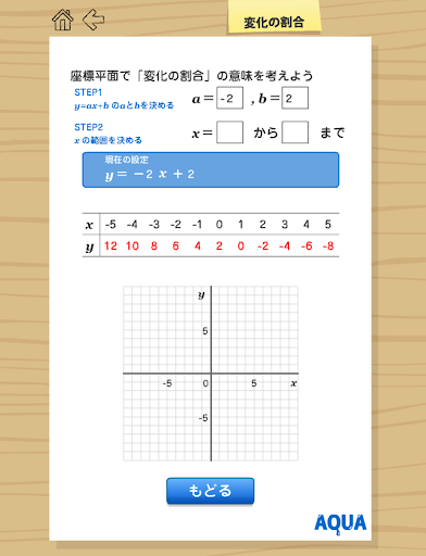 このアプリは中学2年生の「変化の割合」が学べるアプリです。「AQUAアクア」シリーズの全アプリを簡単に呼び出すことができる「総合メニュー」を合わせてご利用いただくと便利です。