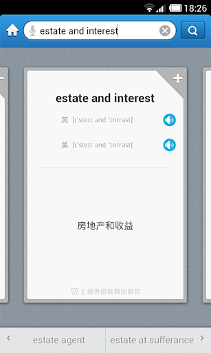 外教社官方权威正版发布,其他同名房地产词汇手册均为盗版。《外教社英汉汉英房地产词汇手册》是由上海外语教育出版社发行的词汇词典类软件,软件收录了房地产基本词汇(英汉、汉英双向收词8000余条),是房地产人士必备手册。本软件由海词词典(中国第一个在线词典dict.cn)提供产品支持,具备手机上最便捷的查词功能(摄像头查词、语音查词等),还有清晰发音、生词收藏、生词辅助记忆等学习功能。选择高品质词典和词汇手册,学习更有保障!