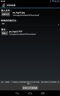 功能强劲的文件格式转换工具,支持电子书、视频、图片、文档、音频、文件的格式转换,使用需要网络支持,发送文件到云端服务器处理完成之后传回手机,支持转换的格式很全面,实在是太给力了。软件支持转换格式:视频:3GP,3G2,FLV,MKV,MP4,MPEG-2,OGG,WEBM,WMV.音频:MP3,OGG,WAV,WMA,AAC,FLAC,M4A,MMF.图片:CJPG,PNG,BMP,EPS,GIF,HDR,EXR,SVG,TGA,TIFF,WBMP,WEBP.文档:PDF,DOC,TXT,ODT,FLASH,HTML.电子书:EPUB,MOBI,PDF,LRF,FB2,LIT,PDB,TCR.文件:ZIP,BZ2,7Z,GZ.