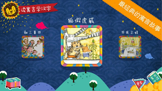 *动物篇包括4个经典寓言故事:狐假虎威、鹬蚌相争、井底之蛙、朝三暮四。