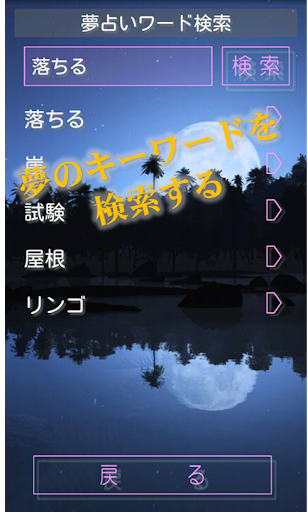 夢のキーワードをカテゴリーごとに区分された一覧から探して、そのキーワードに含まれるメッセージを調べることができます。