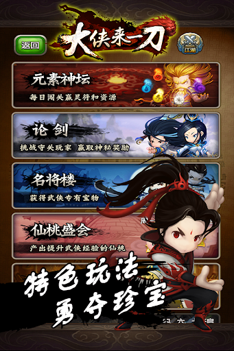 精致的游戏画面,卡通形式的武侠彰显可爱又不失风情,战斗过程更是刀光剑影,6个武侠技能齐放,天昏地暗,激烈的战斗带来的是对实力的执着追求。此外,我们准备了非常丰富的创新玩法,包括元素神坛、华山论剑、闯王宝库、名楼征战等等,各大模式中所提供的关卡与奖励都有所不同,大侠可以根据自己的需求来选择挑战。精致画面,震撼对决,玩法新颖,尽在《大侠来一刀》!