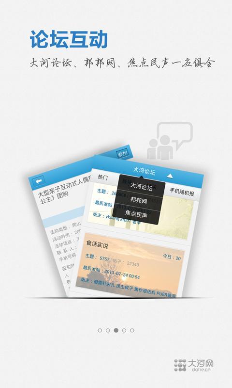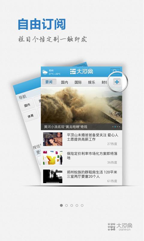 大河网手机客户端是河南日报报业集团打造的精品智能手机应用程序,是河南无线互联网第一 门户。它继承了河南报业人内容精编的优良传统,又结合了网络及3G时代冲浪式阅读的时尚风格 。