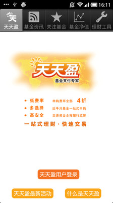 1 低费率: 所有代销基金通过天天盈账户进行基金申购、定投, 前端收费享受4折的优惠费率, 最低0.6%(如原申购费低于0.6%,则按原费率执行)。