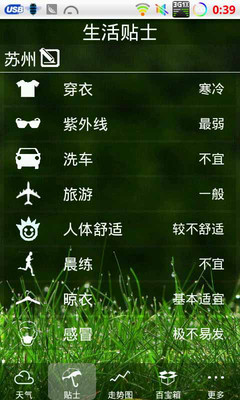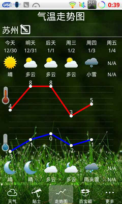 5.天气预报数据全面,5天天气预报,包括湿度、风向等天气数据,同时有当天各种生活贴士、生活指数;还有温度走势折线图。