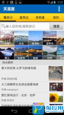 天涯客客户端是天涯社区针对旅游方向设计的无线客户端,整体糅合了游记、周边生活资讯、陌生人交友、个人中心等四大核心功能,解决用户旅行中衣食住行甚至是交友的需求。