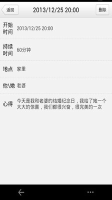 夫妻生活记录仪可以记录你每次夫妻生活的时间、地点、持续时间、心得体会等,把美好的时刻都统统记录下来,以后和爱人慢慢回忆。