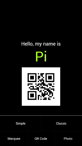 在手機上秀出你的名字,可以附上一張頭像或者二維碼。點擊文字編輯內容,自動生成二維碼。點擊功能表可以在不同風格之間切換。