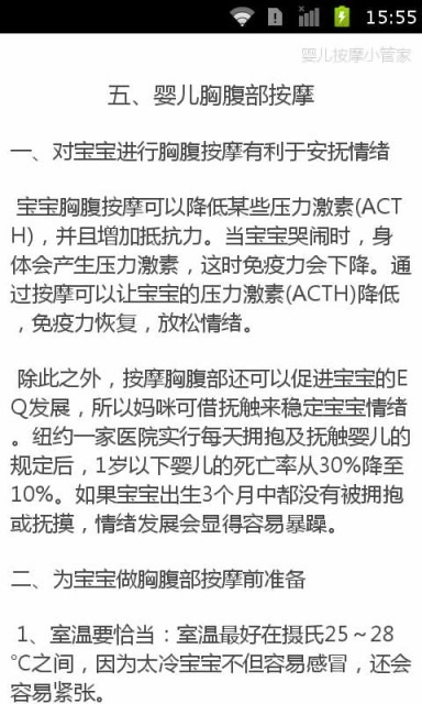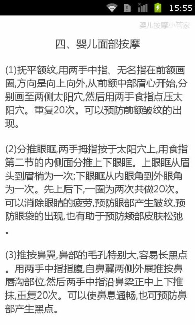 婴儿按摩不仅是父母与宝宝情感沟通的桥梁,还有利于宝宝的健康。婴儿按摩具有帮助宝宝加快新陈代谢、减轻肌肉紧张等功效。通过对宝宝皮肤的刺激使身体产生更多的荷尔蒙,促进对食物的消化、吸收和排泄,加快体重的增长。按摩活动了宝宝全身的肌肉,使肢体长得更健壮,身体更健康。按摩还能帮助婴儿睡眠,减少烦躁情绪。赶快给你的孩子按按摩吧。