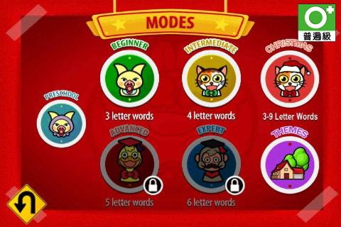 首先選擇你喜歡的遊戲模式,包括學齡前、初級、中級、高級及專業級。隨著每次升級,單詞會變得越來越長,從學齡前模式的三個字母到專業級模式的六個字母。每個模式各有 9 關,很多都必須解鎖才能玩。所以現在立刻開始吧!