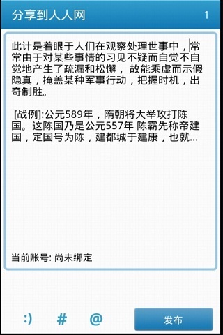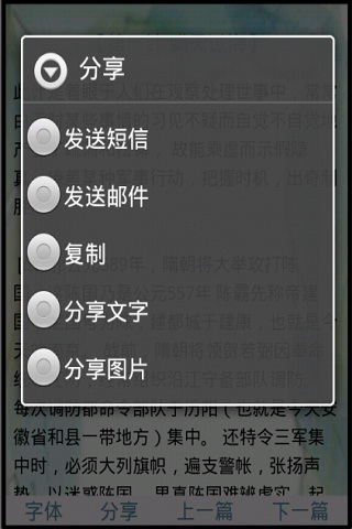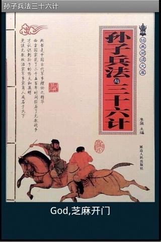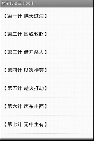 孙子 兵法 三十六计《三十六计》是我国流传较为久远、普及面相当广泛的兵法普及读物,集历代兵家“韬略”“计谋”之大成,有“兵法谋略奇书”之称。素来被人们看重,古人曾有“用兵如孙子,策谋三十六”之说。《三十六计》始见于《南齐书?王敬别传》,共分胜战、敌战、攻战、混战、并战及败战共6套,便于在不同情况之下运用。随着时代的变幻,在今日这个多元化的社会里,这些优秀的传统智谋不仅运用到军事上,在海内外享有盛誉,其影响已延伸到政治、经济、哲学、人生、管理等诸多领域。古老的谋略又焕发出了古老的青春。点击字体按钮的时候,就会出现缩放工具,再次点击字体时,缩放工具就会消失。点击分享,将显示下面的选项。1. 发送短信2. 发送邮件3. 复制4. 分享到新浪微博5. 分享到腾讯微博6. 分享到人人网你可以将知识分享给你的朋友.同时还增加了浏览SD卡图片并把这些图片也分享到微博的功能.安卓1.6及以上可以下载