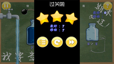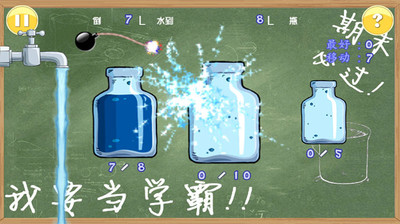游戏分别有简单、困难、巨难等不同难度关卡让你挑战。。玩家用最快速度把水按要求倒进指定的瓶子,就能成功过关,拖动瓶子到水咙头下方,就会自动装满水,双击瓶子将瓶中的水全部倒掉。游戏表面看起好像挺简单,实际要运用到很多数学推理解题的思维,难度绝对不小,不是谁都能一路过关斩将的,谁敢来挑战!