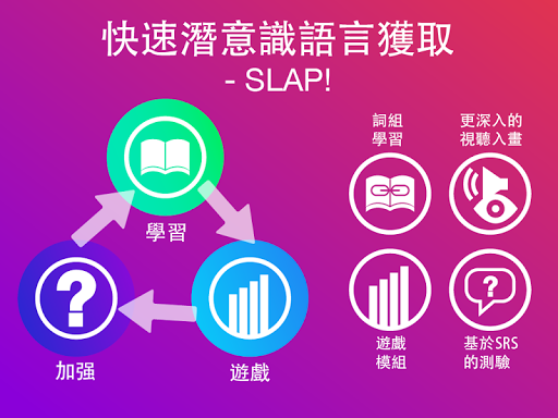 我們稱之為自然語言吸收效果(Subconscious Language Acquisition Performance - SLAP!) ,因為看上去不像在學習,而像在玩!老少咸宜,現在下載試試看吧!