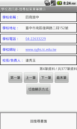 學校資料包含:名稱、地址、電話、網址、負責人/校長。