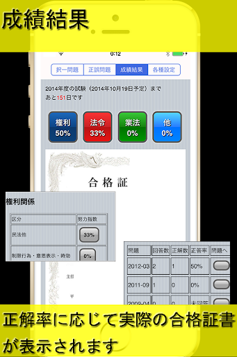 ⇒「宅建漬」では各分野別の成績に応じて実際の合格証書が表示されます。