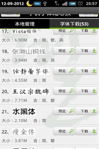 安卓字体大全是一款小巧,方便的手机字体更改软件,集成了几十款中文美化字体,有可爱字体,华康少女字体,萝莉字体等多种字体,均已经过测试,只需要简单的点击几下就可实现字体更改.