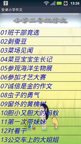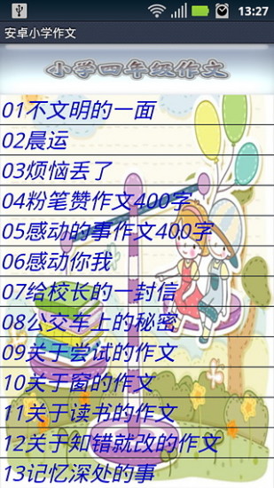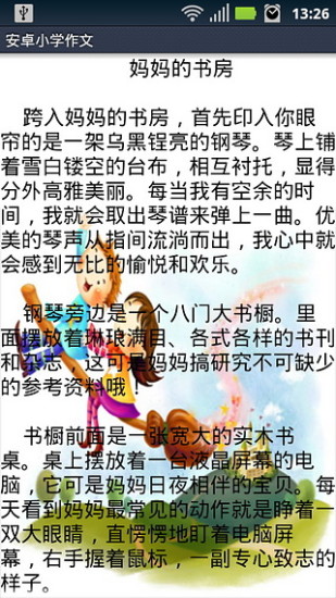 你还在为孩子的作文而苦恼么?你还在为孩子半天半天写不出一个字而烦恼么?那就快来下载安卓小学作文吧,它是一部全面辅导小学一至六年级的经典作文辅导教科书,相信我们,孩子的未来我们一起创造~~v1.3版本1,首先解决用户所说的界面不能翻页;2,解决背景与文字的冲突;3,解决字体过小的问题;4,增强了运行时的流畅性.5,我们将会一直努力,在这里谢谢各位用户的支持.v1.4版本1,修改了部分用户反馈回来的无法正常退出的bug;
