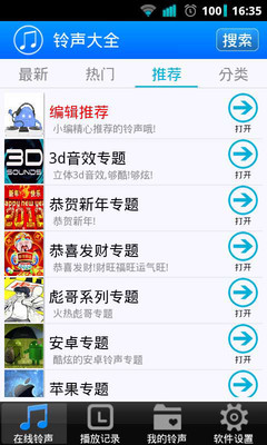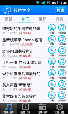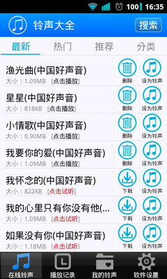 您还在为手机那鸡肋的铃声设置烦恼?还在为到处寻找好听铃声而烦恼吗?那请马上使用本应用!本应用是一款提供最热最新手机铃声下载并可以直接设置手机铃声,短信铃声,闹钟铃声.