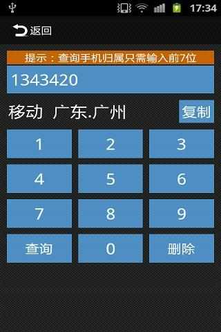 支持归属地手动查询,查询手机号码归属地,只需输入前7位,支持复制结果功能;