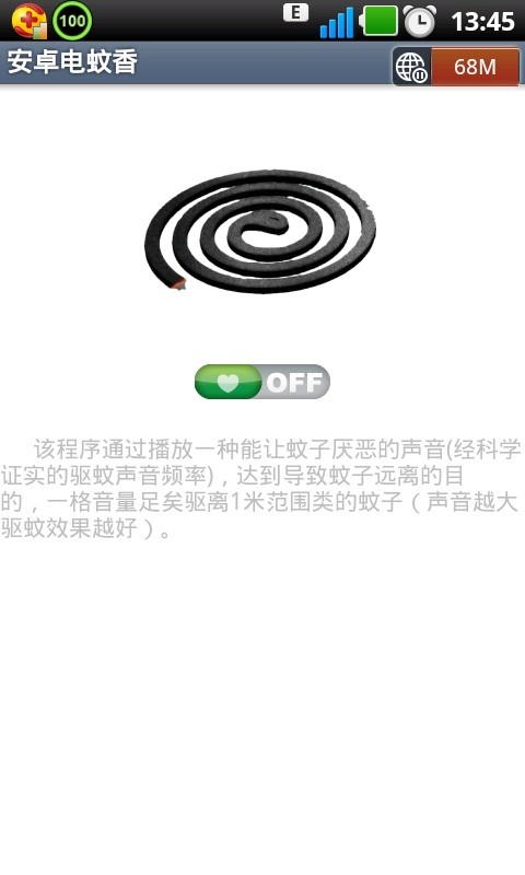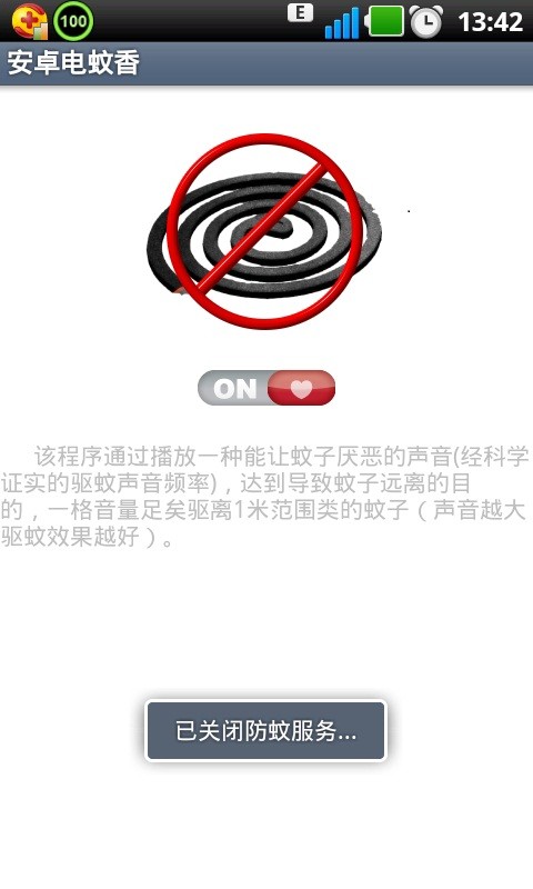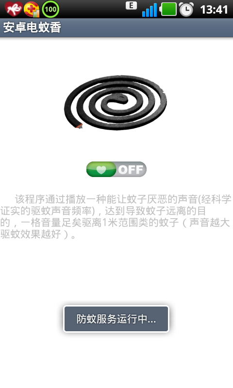 一款不错的实用驱蚊生活小助手!该程序通过播放一种能让蚊子厌恶的声音(经科学证实的驱蚊声音频率),达到导致蚊子远离的目的,一格音量足矣驱离1米范围类的蚊子(声音越大驱蚊效果越好)。祝您生活愉快!