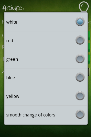 此外,在應用程序中,我們集成了夜燈。這主要是為了誰也不敢睡在黑暗中的孩子們。夜間光線照射一段時間,然後關閉(配置)。在完整版中,你可以選擇顏色的光,以及平滑的顏色過渡。這是美麗的。