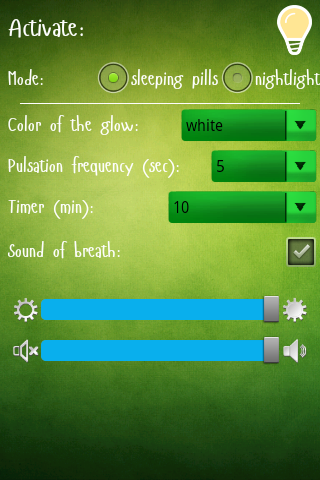 我們決定,該手機擁有所有這些功能。為什麼你需要購買不必要的和昂貴的設備?功能(原型)已大大增加。您可以選擇不同顏色的光,選擇一個特定的時間自動關機(完整版)。然而,儘管事實上的脈動時,眼睛是閉著的,是可見的(在房間裡應該是暗),我們還增加了呼吸的聲音,伴隨著脈衝。默認的脈衝頻率為5秒。這是成人的平均水平。但是,對於孩子,你可以配置更頻繁的脈衝。兒童呼吸更加頻繁。當發光是光明的,它是必要的,吸氣時消失的光芒呼氣。如果你的呼吸,你或多或少可以設置不同的頻率。該應用程序有很多不同類型的呼吸選項。