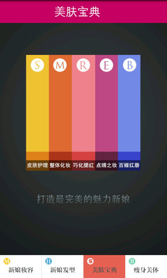 本软件中介绍了新娘妆容的风格介绍、妆容小课堂、以及在妆容上的禁忌;以及最新潮流的新娘发型;皮肤护理、整体化妆、腮红、点睛、唇红等细节处理;同时也举出了一些婚前瘦身的小绝招,成就最完美、最健康的你,成就你的完美新娘梦。