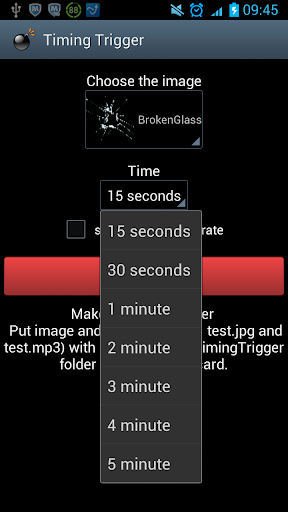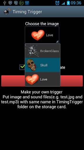 你可以定義自己的觸發器,只要把圖像和音效檔(如test.jpg,test.mp3,使用相同的檔案名,音效檔是可選的。)放在存儲卡上的 “TimingTrigger” 資料夾。然後設置時間(如15秒),按一下“開始”按鈕,TimeTrigger會隱藏在後臺運行,時間到了會顯示所選擇的圖像,以及播放聲音,還可以設置是否震動。