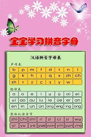儿童教育,宝宝学汉语拼音字母,幼儿启蒙, 亲子教育,智力开发,通过图文和声音想结合的方式生动形象的向宝宝提供学习资源。显示的图片好所发出的声音让宝宝记忆深刻。达到事半功倍的学习效果。并且可以通过考试的模式增加学习乐趣和提高效率。 【基本信息】 作者:gll_2012 更新时间:2014-04-22 版本:1.6 系统:Android 2.2.x以上 语言:中文 【更新内容】 1, 完善主界面布局。改善UI美观。