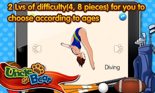 《体育拼图》是“熊大叔儿童游戏“专门为宝宝设计的一款场景化识物拼图游戏,1岁以上的宝宝就可以开始使用。在场景化的游戏过程中,不仅提高了宝宝的动手能力,识物能力,培养了宝宝的发音水平,同时还能让宝宝在游戏中学习到其他语言的读法。在宝宝的心目中,“熊大叔”是一个手掌上的双语幼儿园!
