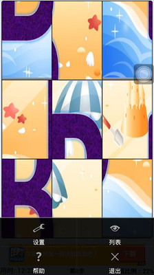 2)点击“菜单”,可进入“列表界面”,在列表项中,单击图片进入可进入拼图界面。 3)点击“菜单”,可进入“设置界面”,在设置界面中,可以进行游戏的难易设置和图片分割的行列数。