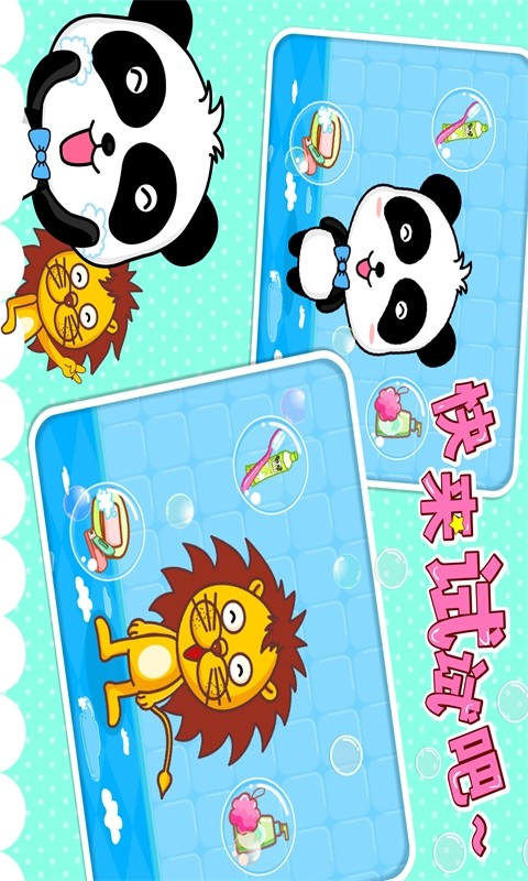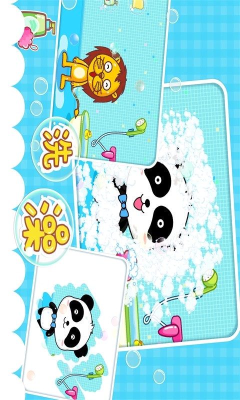 洗澡:哈哈,动物伙伴来洗澡,好多的肥皂泡泡,左扭扭,右扭扭,泡泡不见了,哇哦~还有blingbling的小星星~真漂亮。