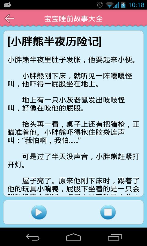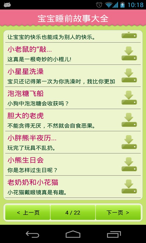 《宝宝睡前故事大全》包含大量故事,每天晚上给宝宝讲故事,是最能给他们带来亲情和安全感的时刻,宝宝听故事的时候也是最快乐的时候,睡前故事大全专门为哄孩子们睡觉准备的故事,优美的故事语言,舒缓的故事情节,美好的故事结局,把宝宝带入甜蜜的梦乡。